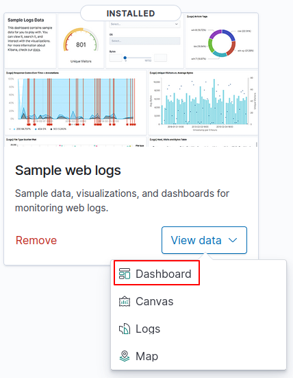 그중 가장 오른쪽에 위치한 Sample web logs을 눌러 대쉬보드를 열어본다.