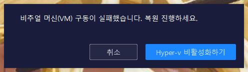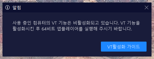 해당 오류는 VT 가상기술이 BIOS에서 활성화되어있지 않아서 발생되는 문제이다.