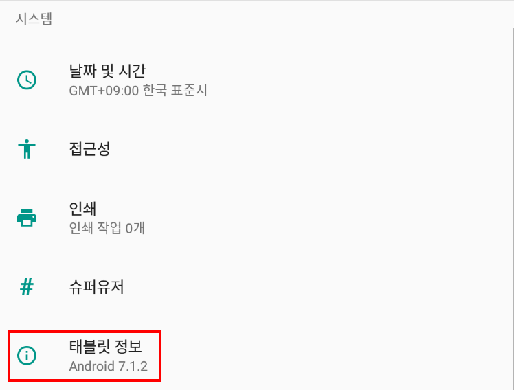 이전 화면에서 태블릿 정보 위에 '개발자 옵션' 히든매뉴 활성화