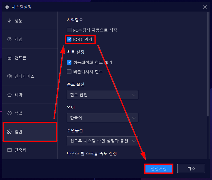 설정 - 일반 - ROOT켜기 - 설정저장 - 녹스 재부팅