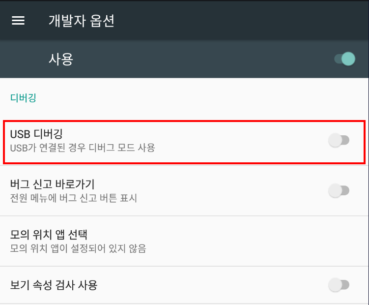 스크롤 아래로 내려서 'USB 디버깅' 활성화