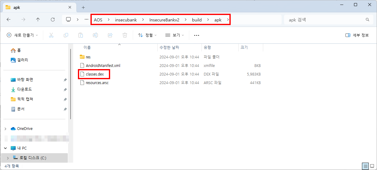만들어진 폴더에서 다음 경로로 이동해보면 classes.dex 파일이 존재한다.