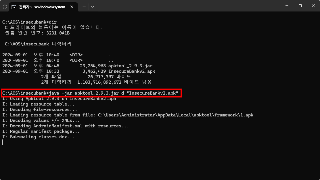 java -jar apktool_2.9.3.jar d "InsecureBankv2.apk"