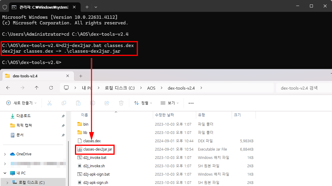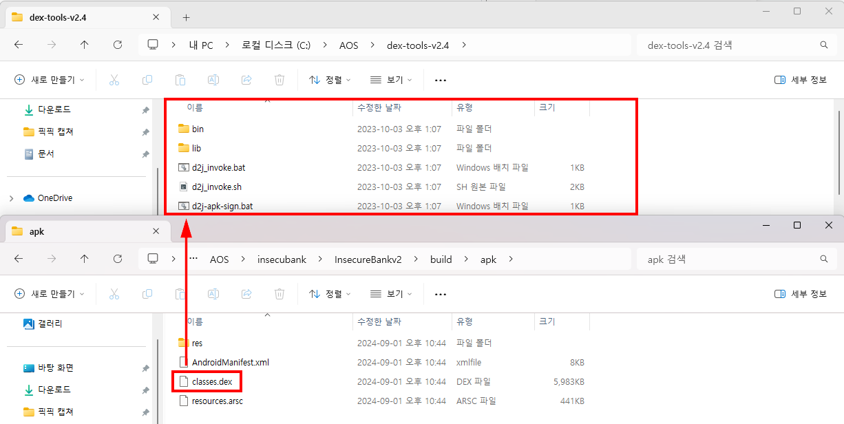 아까 확인한 classes.dex파일을 dex-tools-v2.4 폴더에 복사해 준다.