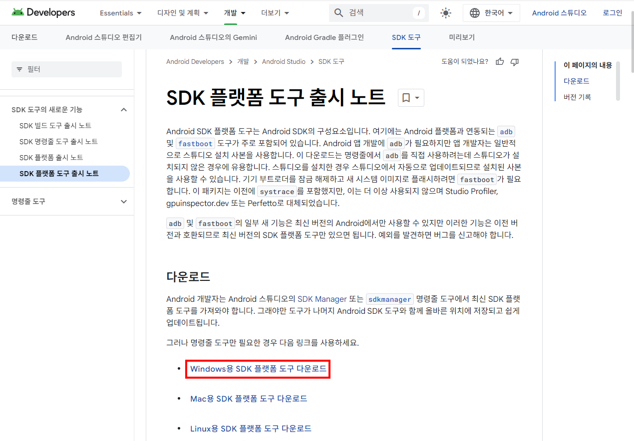 https://developer.android.com/tools/releases/platform-tools?hl=ko