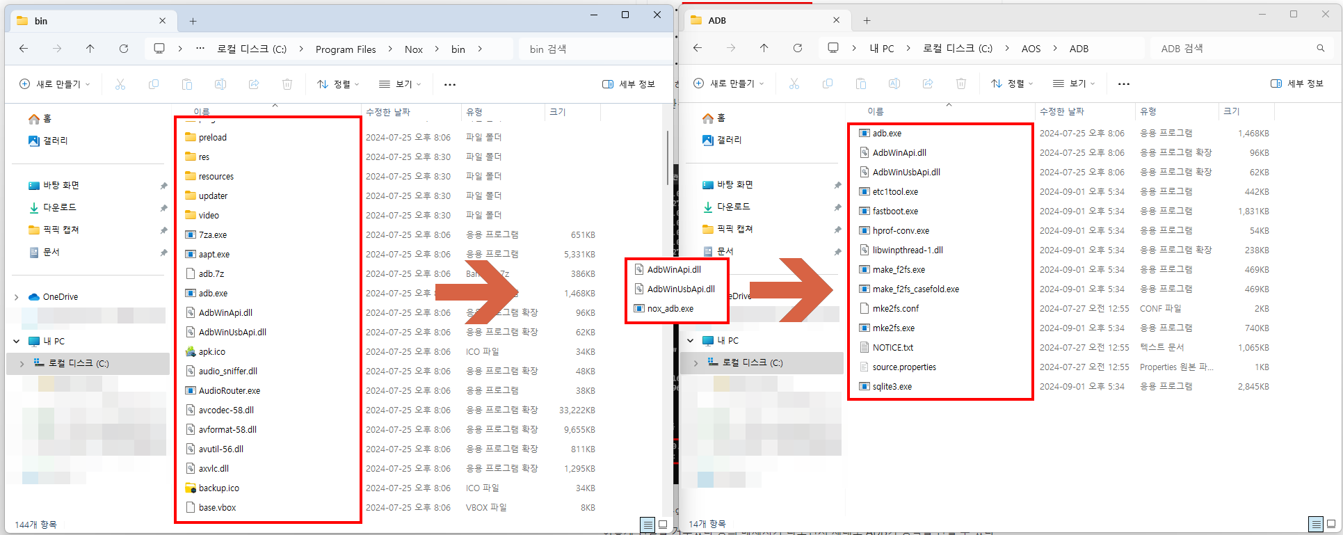 nox_adb.exe라는 파일은 adb로 바꾸고 그 전에 기존 adb는 삭제해준다.